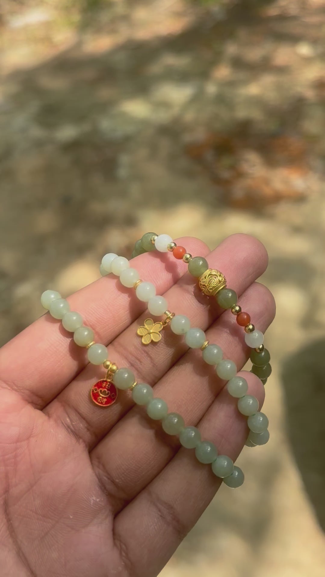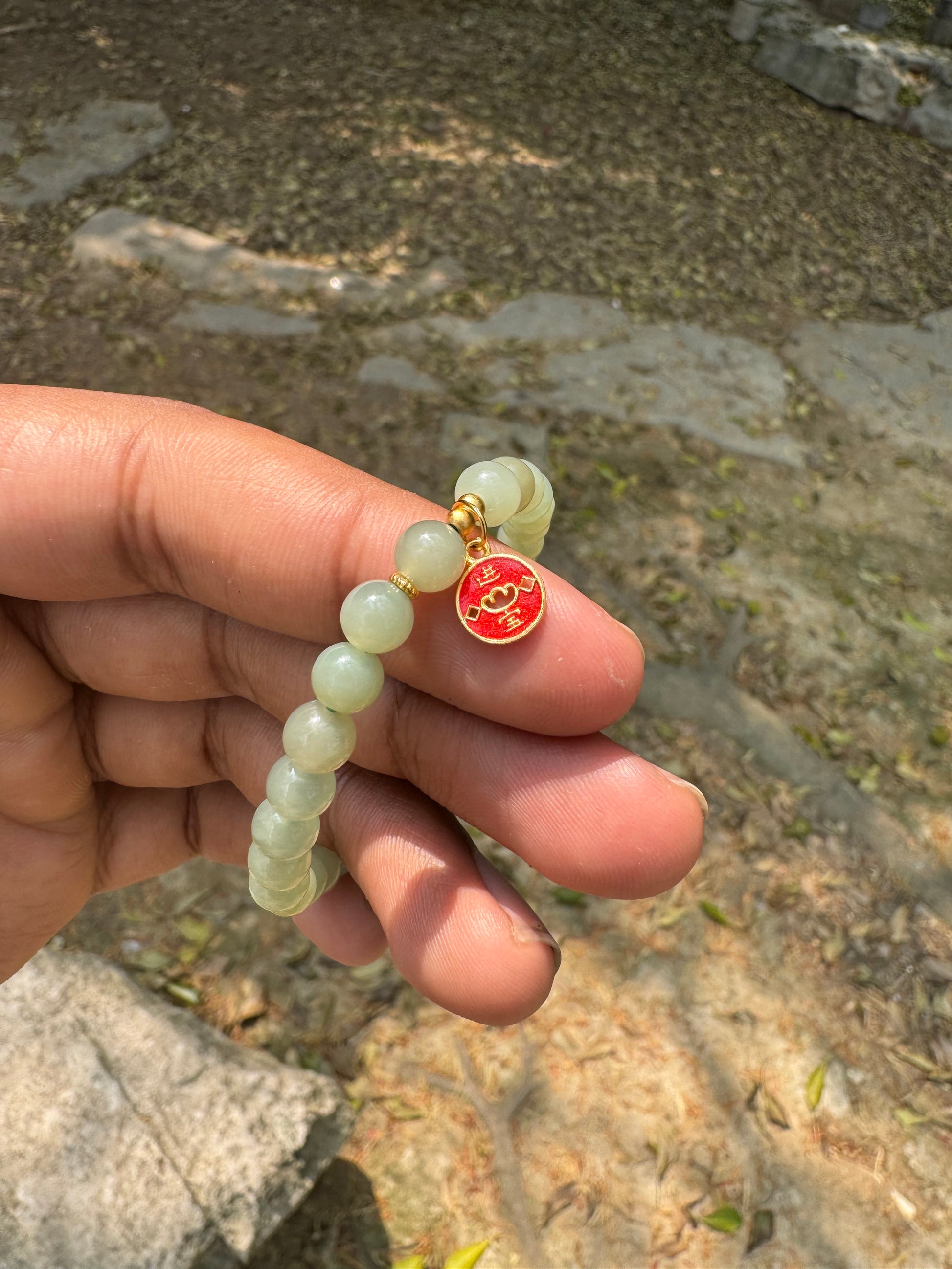Modern, minimalist spin on a classic Chinese lucky bracelet. Features a red pendant engraved with the phrase "Let riches and treasures come into your house" (招财进宝); perfect for people looking for more luck and protection in their lives. Light green nephrite jade with 14k gold-plated sterling silver.