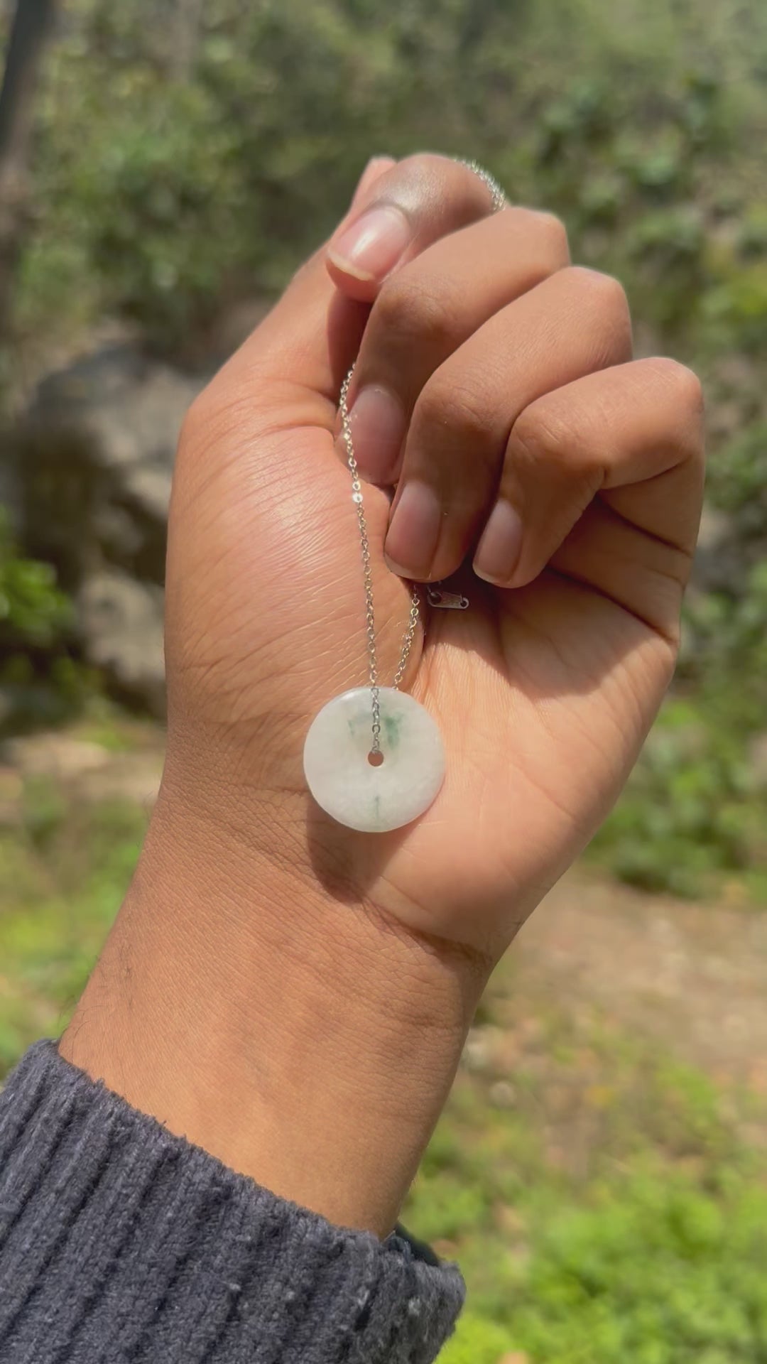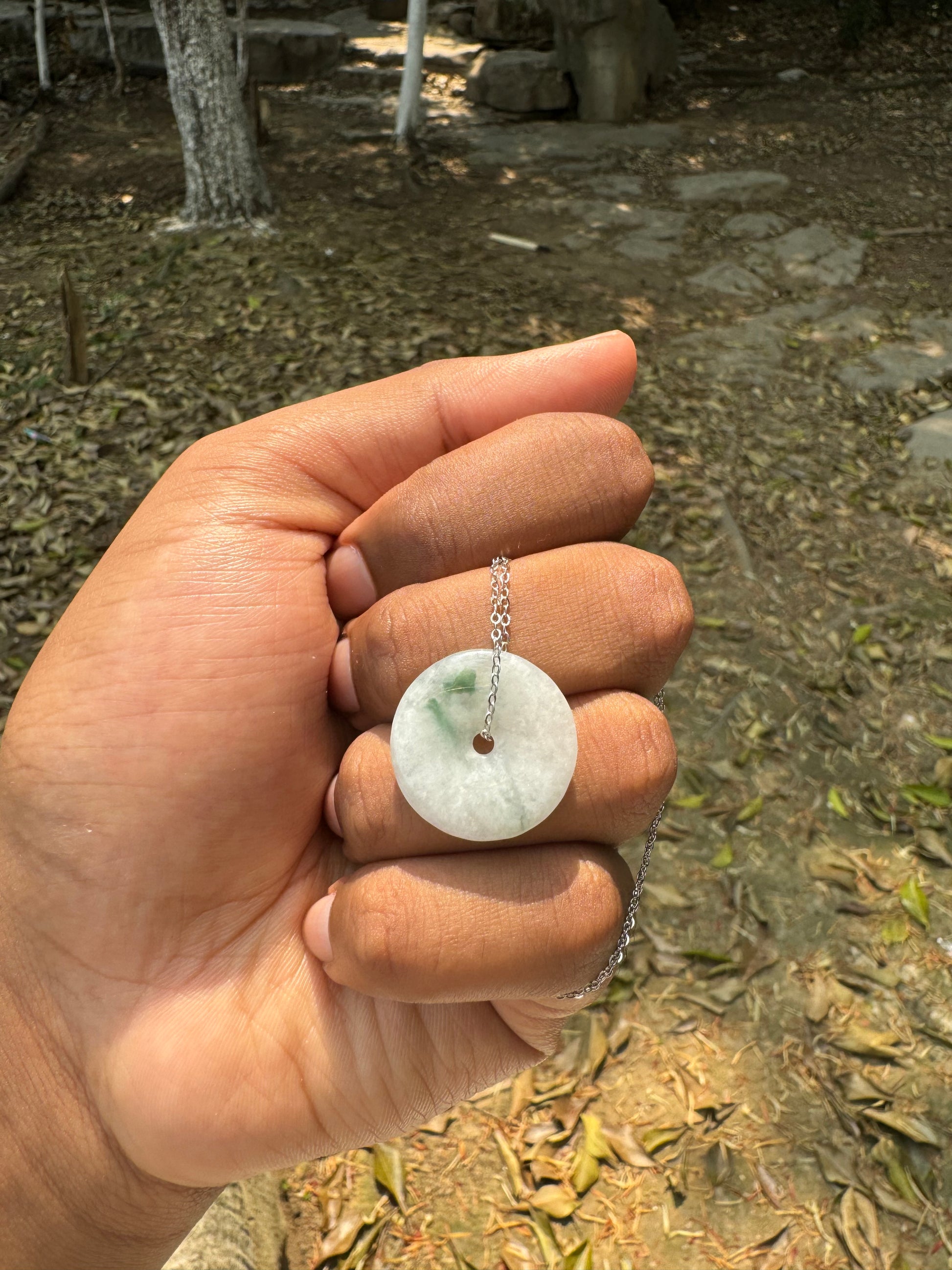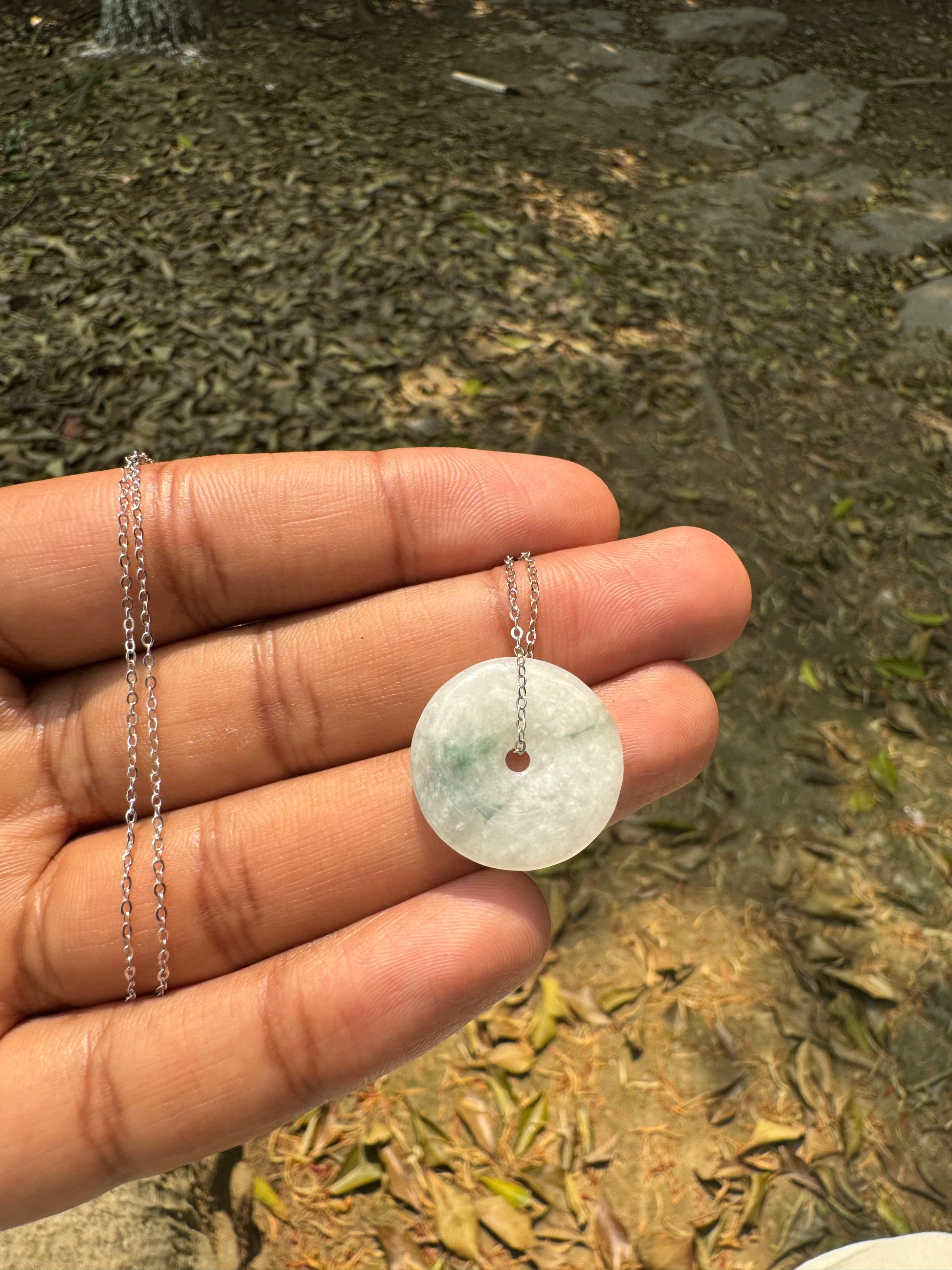 This small, dainty modern necklace is inspired by the classic jade style "Moss in the Snow", which is when a white jadeite piece has flecks and spots of green jadeite mixed naturally within. The Ping'an pendant "平安扣“, a traditional amulet of protection in China, is paired with a thin, 100% sterling silver chain.