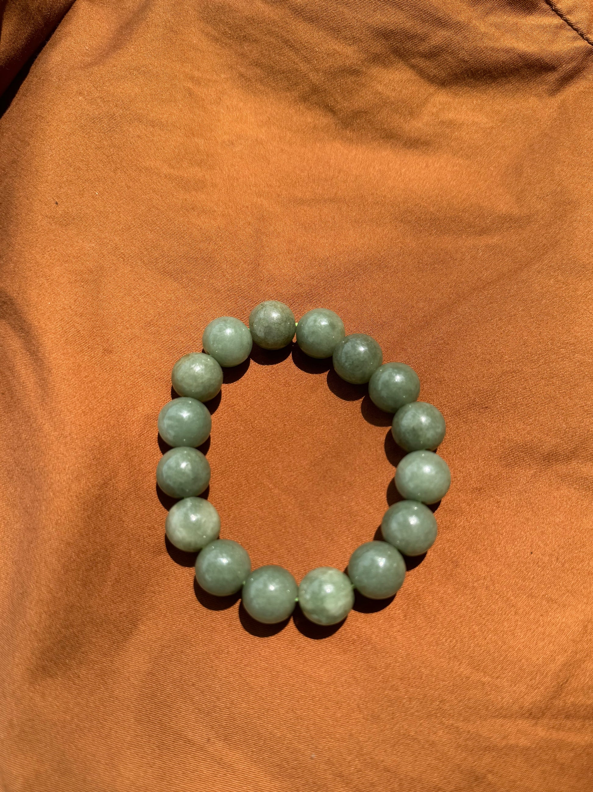 Large 13mm beaded jade bracelet, recommended for larger wrists, in a deep, dark translucent green. Perfect for classy, chic outfits.