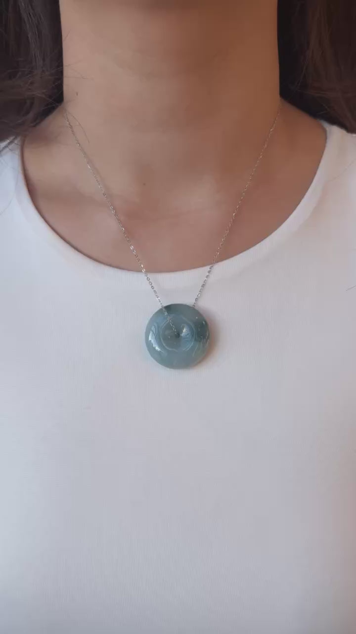 This necklace's flowing, blue color pattern is reminiscent of ocean waves and deep sea color. The large Burmese jadeite Ping'an pendant "平安扣“, a traditional amulet of protection in China, is paired with a 100% sterling silver necklace.